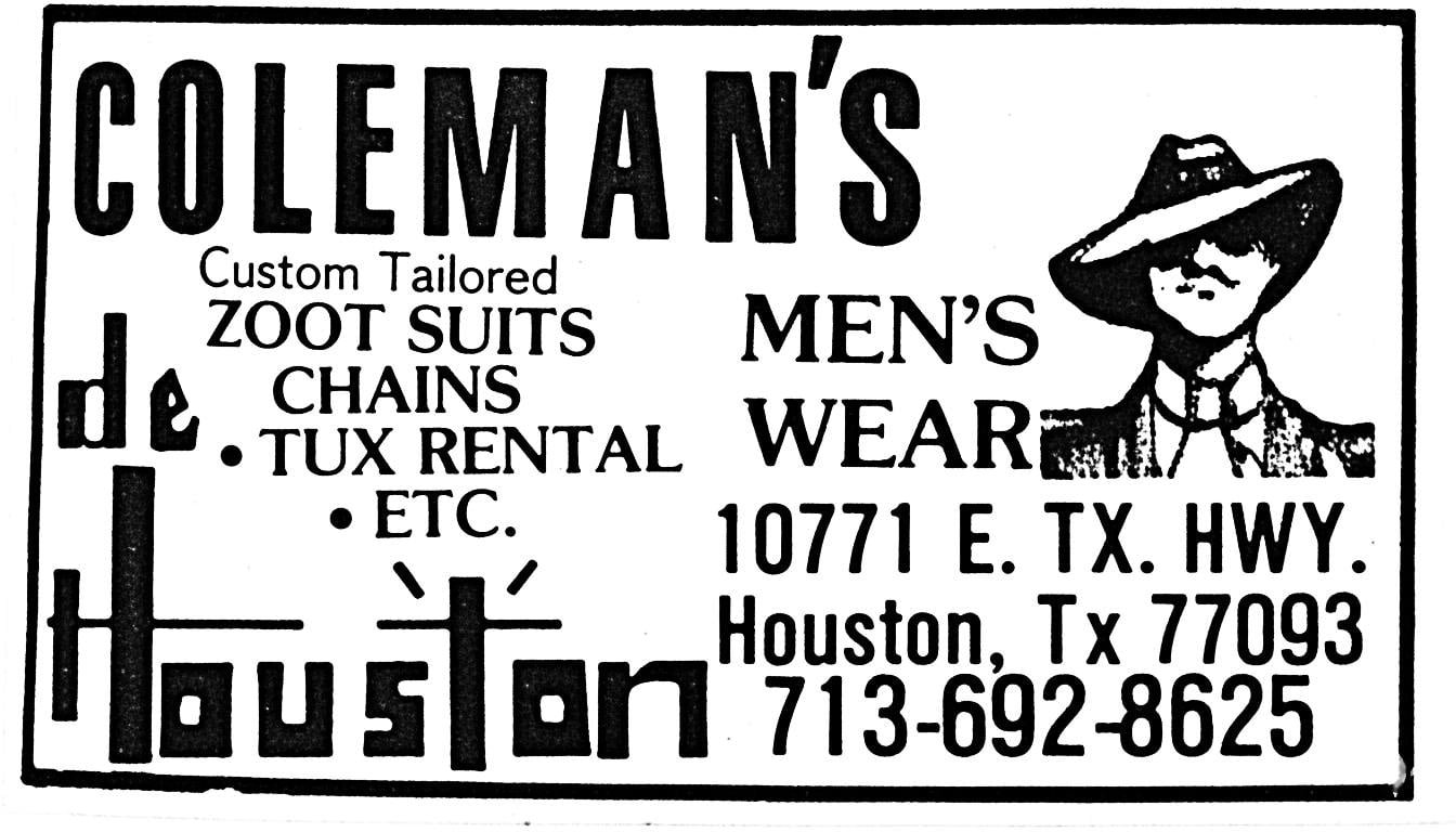 After finally nailing Del Bosque’s request, the Zoot suit left the building. From then on it made its way around Houston or to wherever Del Bosque would take it. Word got around and next thing you know, Coleman’s Menswear becomes the spot when it comes to getting a custom zoot suit made. From this sudden increase in Chicano traffic, Joe Coleman becomes interested in the culture and begins getting involved through lowrider shows or other get downs. Through that involvement, Coleman’s becomes the spot for all the Chicano gear, from Stacy Adams to chains to belts to fedoras to zoot suits to Lowrider Magazine to Teen Angel to Chicano Art T-Shirts, Coleman’s is the SPOT!